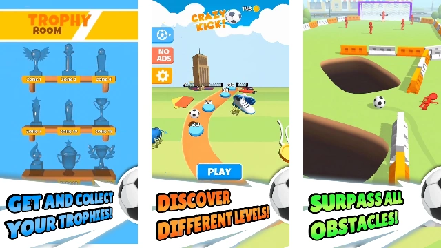 Crazy kick is the first football game where you control the ball and not the players! Overtake your opponents, move swiftly, and shoot goals! Dribble, pass, and kick. Have fun and show your football skills Forget about traditional football games where you control 11 football players or play the soccer team manager. Here it's easy, you control the ball and can do crazy things to score! Can you score goals and reach the football World Cup Final? Competition is fierce and the top eleven football players want to kick you! But you won't let them: dribble, tackle, make fun of them, and score that goal! Real football experience with easy controls and enjoyable movements. Compete against your friends and show them your skills!