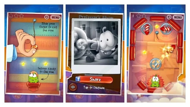 Eager to learn more about Om Nom's adventures? Watch ""Om Nom Stories"" cartoons and other amazing videos on our YouTube channel! www.zep.tl/youtube Feed Om Nom candy through a series of exciting experiments! Enjoy everything you love about the original Cut the Rope with new challenges and a new character, the Professor! You’ll team up with the Professor, a goofy mad (but not bad!) scientist studying Om Nom’s sweet tooth in his secret lab. Play with new gadgets, such as suction cups, and activate superpowers to collect shiny gold stars, uncover hidden prizes, and unlock new levels! Key features: - Innovative physics gameplay - Adorable character - Outstanding graphics - Om Nom animation shorts - Superpowers - Earn or purchase candies for more levels About the game: “Cut the Rope: Experiments from ZeptoLab follows the exact same formula as its predecessor, which means it's awesome.” - IGN “If Cut the Rope: Experiments uncovers one scientific truth, it’s this: ZeptoLab knows how to put together a charming puzzle game.” - Tapscape “Cut the Rope: Experiments takes the original's addictive formula and adds a splash of deviousness, thanks to the addition of some cunning new items.” - Pocket Gamer “This sequel to the smash-hit physics game features more of the adorable Om Nom, who has the best name of any game character ever.” - CNET.com