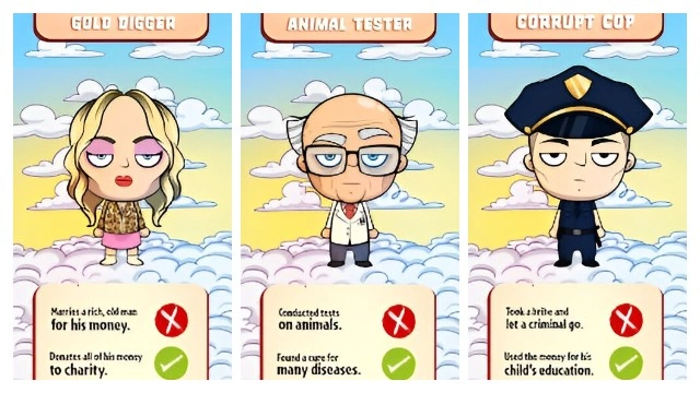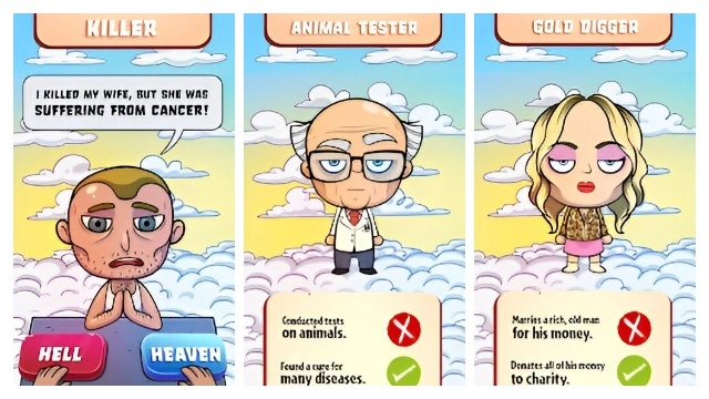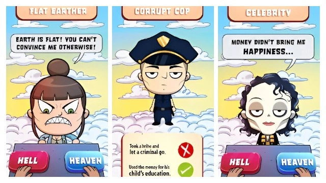 It is Judgment Day and here you are. As the Angel of God, you are in charge of judgment on the reckoning day! All souls in presence with their good works and sins. You will decide who is sinner or innocent. They will confess to you what they have done during their lives. Sometimes you will interrogate them with the lie detector. Here they are: You already know most of them. They are famous people. Characters left their marks in history: commanders, emperors, queens, kings, celebrities, intellectuals, musicians, imposters, scientists, movie and cartoon characters. Some of them are ordinary people with ordinary lives. Doctors, teachers, students, activists, landlords, and so on. You will like attractive graphics with easy and fun gameplay: - Decide whether they go heaven or hell - Scroll right or left to send them to heaven or hell - Interrogate them by using the lie detector - Force them to confess their sins - Collect coins and use them for characters to confess - It is up to you to give them one last chance - Unlock new angel skins - Enjoyable mini-games - Burn one, save one levels - Choose the most evil one test - Special levels with famous characters - Match the souls and bodies Be fair and secure justice. Judging in the afterlife requires being merciful but righteous! Enjoy the game committed to fun!