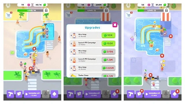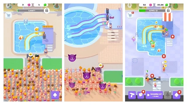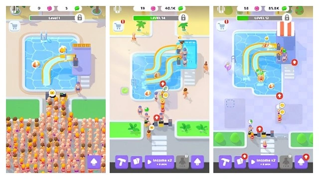 Welcome to the Aquapark Idle game, the ultimate idle tycoon game where you can build and manage your own water park empire. Start small with just one employee by expanding your waterpark limits with thrilling water slides, wave pools, and more. As an idle tycoon game, you can passively earn income and even reinvest to further expand your empire. Decorate your aquapark with eye-catching photo zones, lush landscaping, and stunning water glides to create a unique and inviting atmosphere of an idle aqua park. Take care of your guests’ needs by hiring new personnel who will keep an eye on their happiness and comfort. Do your best and turn your little boring waterpark to a large profitable Aquapark Idle business! Challenge yourself trying to avoid long queues with angry people - it’s your chance to upgrade all your management skills. Make your aquapark business work the way you want it to! Dive into the game now and build, expand, and manage your own water park empire. Create unforgettable experiences for your guests and watch the entire business grow while you’re relaxing! Join Aquapark Idle and become the most successful businessman in this exciting combination of the idle and strategy genres!