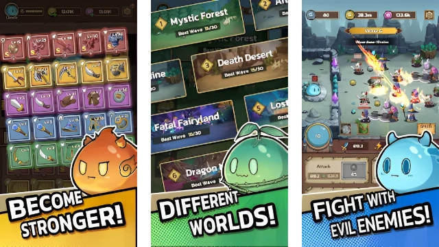 Become Slime Hero! Defend forest against human invasion in the idle RPG TD game! The bad humans are invading the mysterious forest! The slime kingdoms in the forest are facing a tremendous crisis! As a slime chosen by the Slime Sage, you can enhance your abilities through battles, collect legendary equipment, utilize powerful skills, defeat waves of terrifying enemies, and safeguard the peace of the forest. Once you are defeated, come back stronger! Slime Castle - Idle TD is a role-playing idle tower defense game. Players could enjoy an excellent role development system, countless powerful weapons, and several impressive battle scenes. ==== Game Features ==== -Auto-battle system with simple idle clicker gameplay. Enjoy a delightful time! -Many distinctive maps and different enemies with unique skills. Explore more secrets of this world!. -Flexible and diverse upgrade system. Build your exclusive fortress! -Collect mighty equipment and level up the adorable slimes. Experience an extraordinary adventure! -Abundant free rewards to claim. No need to worry about gold anymore! -Set battle strategy by combining fortress, equipments, and control enemies. Find the optimal methods to defeat your enemies!